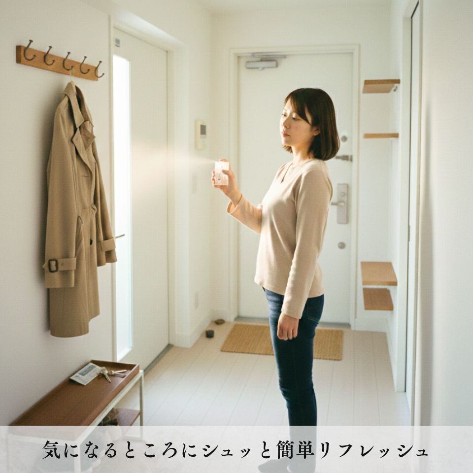 ・お出かけ前や大切な予定の前に、洋服の袖や胸元などへ1〜2回、軽く吹きかけてご使用ください。